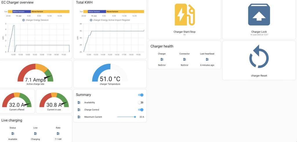 Excuse the mis-labelling of KWH for Amps in the big gauge 😉 This is a direct feed from the charger. I have plans for some automations, once I've added the Octopus integration which shows real time tariff prices. So my plan is to make a live graph of charging costs. Man's got to have a hobby 😉
