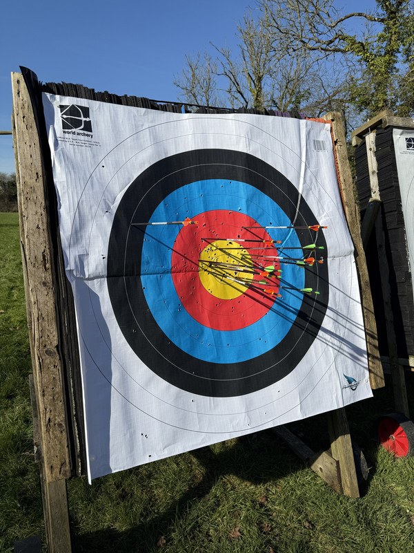 First archery session since last year, a soft tissue injury meant missing the indoor winter season, so I’m out of condition, and using new carbon fibre arrows with spin vane flights. Mine have the orange flights, final end after nearly two hours, and getting very tired! Shooting at 30 yards. 😁