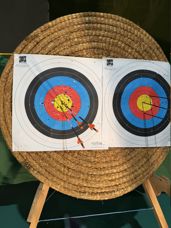 That’s two 10’s and a 9. 😎 Shooting indoors we only shoot three arrows per end, whereas it’s six outdoors.