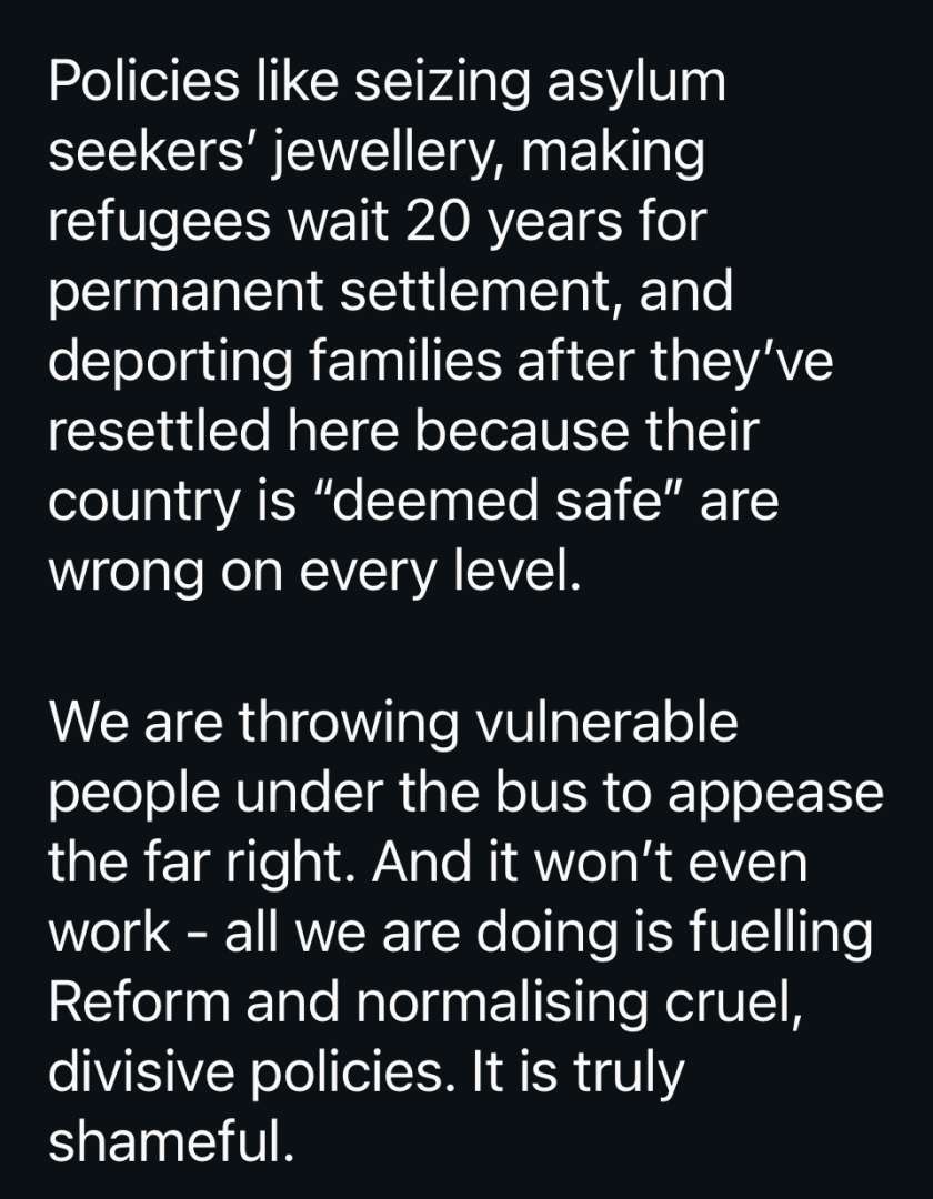 Removing indefinite leave to remain status for successful aslym seekers is inhumane. To spend the rest of your life with the fear of being deported? This is only a paper thin step away from the nut case policies of the Tories and Reform on deporting people with ILM status.