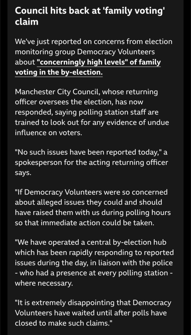 Manchester City Council, whose returning officer oversees the election, has now responded, saying polling station staff are trained to look out for any evidence of undue influence on voters.