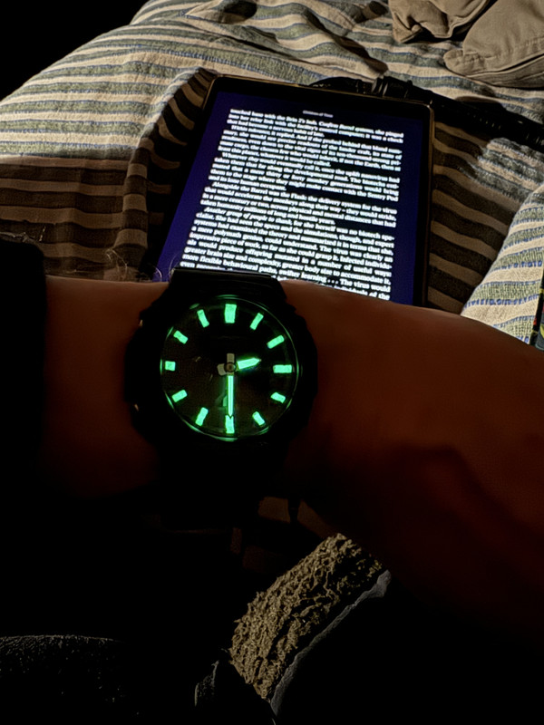 I redid the lume on the black G-Shock, with some white, and instead of using the little applicator spatula thing, I very carefully painted the indices with a very fine brush. Much better results, it’s smoother, and being white matches the hands better. Still glows green, but it’s brighter and more even glow.