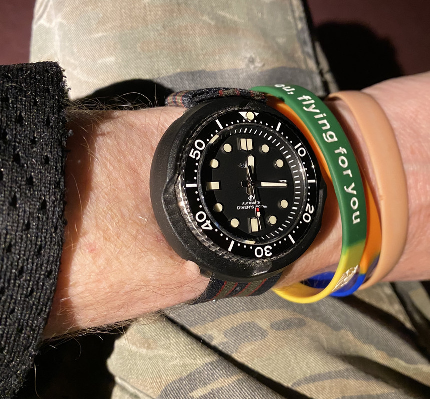 Inspired by all the Seiko's on this thread, this was reduced to £200 and thought I'd give it a whirl. Its a Solar Tuna type homage in Save the Ocean flavour. Came with a black shroud which actually did not look as bad as I expected and felt really light to wear. I swapped over to a stainless imported shroud, as I though it would look more like my idea of a proper watch (and it probably does).