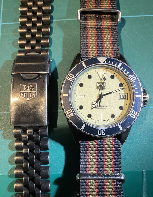You’ll have to zoom in a bit, the wear is apparent on the edges of the lugs. The bracelet is very worn, but it’s never really fitted me very well and rattles, so it wears a James Bond nylon, the correct colours, not the grey and blue ones. Just to add, it’s not the original face, which had Series 1000 underneath the logo - the retaining pins broke and it went back for repairs and that was the face it came back with. Apparently there were a number of variants, as it was Heuer’s first dive/sport watch, and their first watch with TAG, so some variants just had Heuer, some like mine is now, and some had Series 1000. Bugger-all I could do about it really, it went back through the retailer in Bath I’d bought it from.