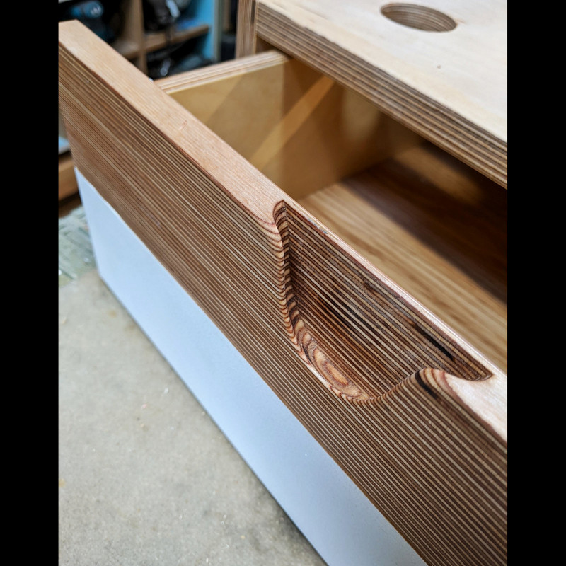 Thanks. Yeah, cheap structural ply 18mm, £37 a sheet. Was going to go with 2 layers till I realised how heavy it is so just added a double-edge for looks and to strengthen. Pot luck with the board quality, the underside has some bad knothole gaps. Edges were better than I expected though with only tiny filling needed. A lot of sanding then Danish oil with wire wool between coats to get the finish.