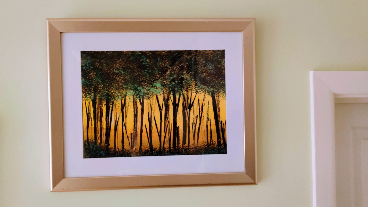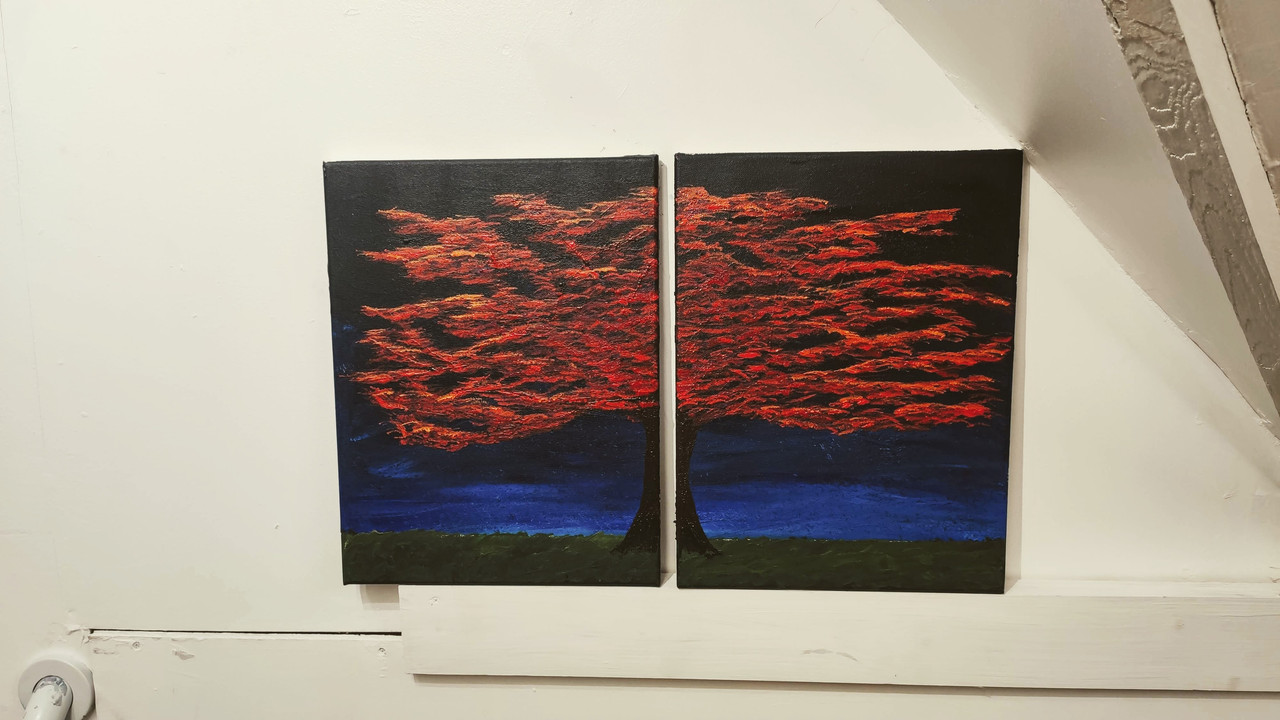 The tree on the pair of canvas (Pear tree?) is not quite finished around the trunk but you get the idea