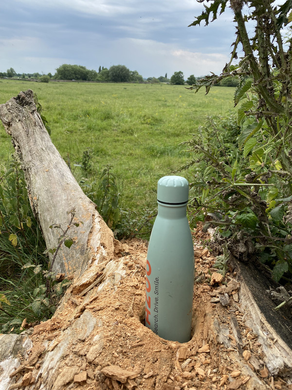 Neither the time nor available space to work on anything much, and not much inclination, tbh, but we were given Friday off, those whose shift patterns covered the weekend, and after prevaricating over whether to go out somewhere because the weather looked really iffy, I went over to Lacock and had a walk out of the village then followed the river back. Partway round there’s a convenient fallen tree trunk that’s just right to sit on for a drink and a snack, but there’s nowhere to put an insulated drink bottle without it falling over. So I made a drink holder.