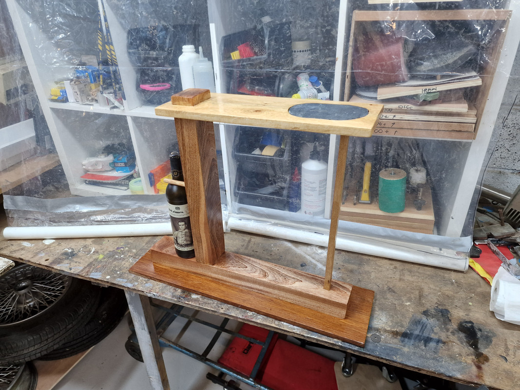 Anyway, this morning I decided to make a narrow table for the gap between the chairs that can hold a glass and bowl of nuts while still fitting. Also added a wine bottle steady storage to balance out the design.