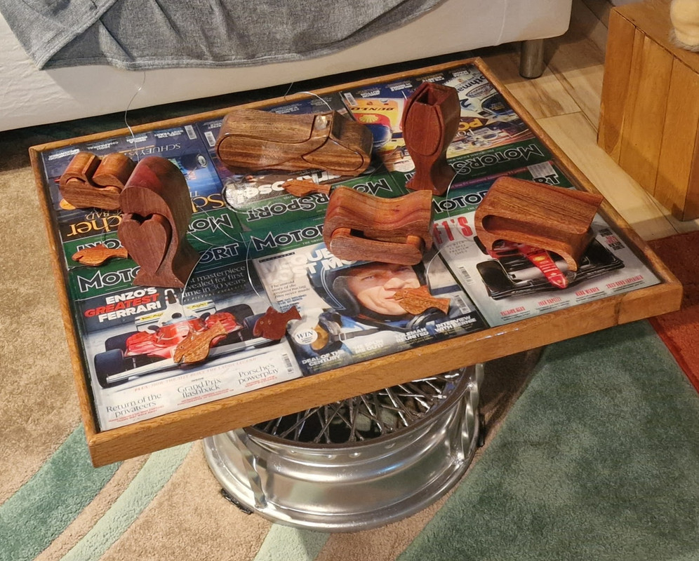 I present 5 bandsaw boxes of various designs, a mobile phone desk tidy and a school of fish, all stood on my Motor Sport inspired coffee table.
