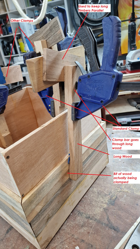 I am making the base of the coffee table and needed to clamp some wood but my clamp could not reach. Rather than buy a deep throat clamp I put holes in a couple of bits of wood, threaded the small clamps through and suddenly had deep throat clamps. The two bits of wood above the clamp is to keep the long wood parallel.