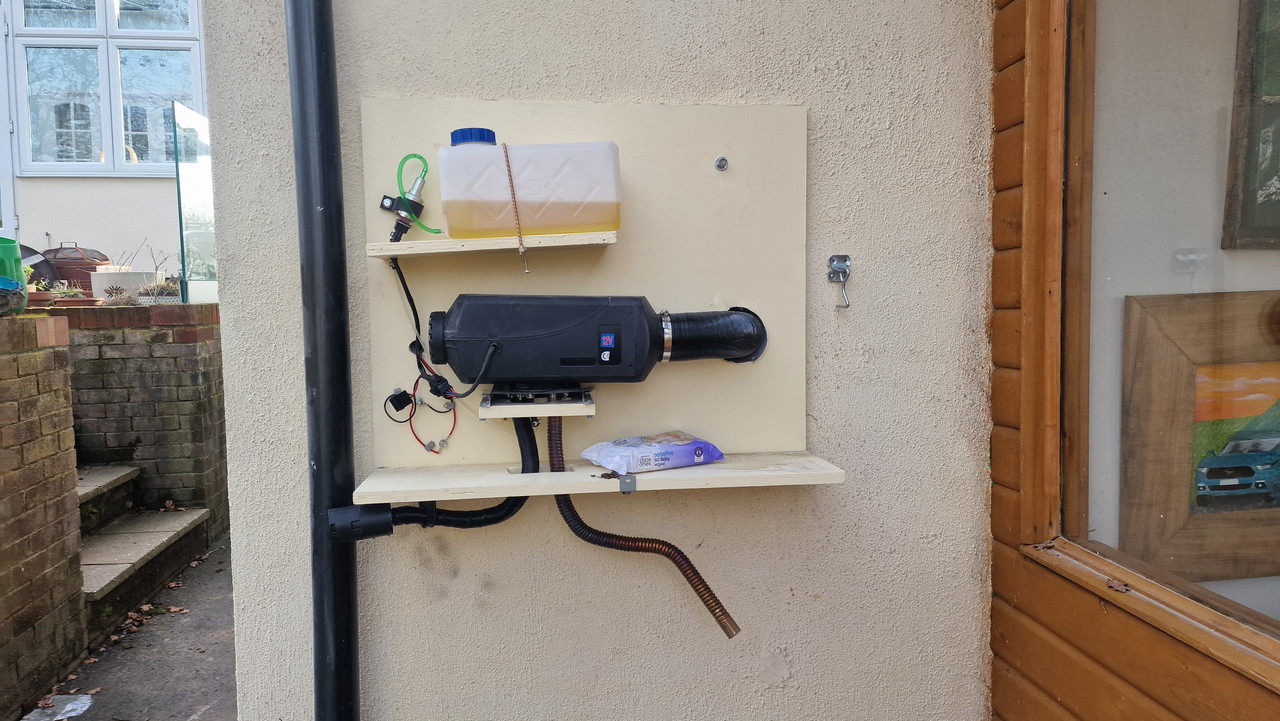 And a final point is that maybe screwing the thing that's designed to burn diesel to the back of a wooden cupboard door is not the safest route. If it does catch fire it'll melt the diesel container, neatly flooding the whole thing with a fuel source. Don't know how hot the exhaust is but pointing it at a wooden wall also doesn't seem as safe as it could be...