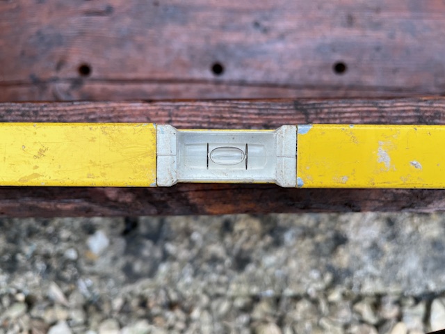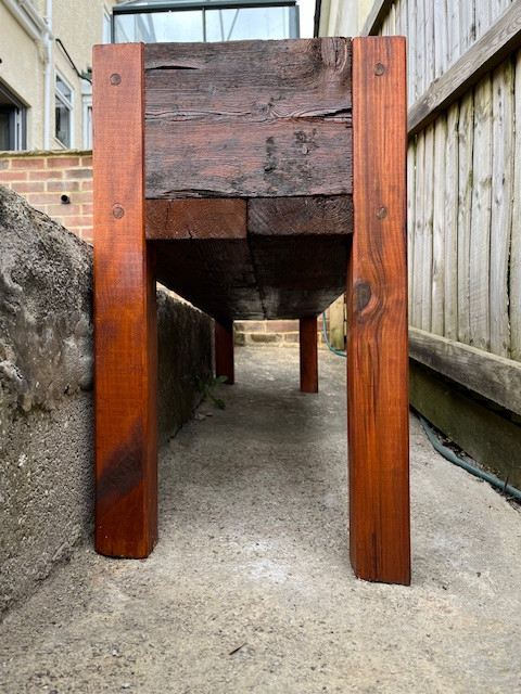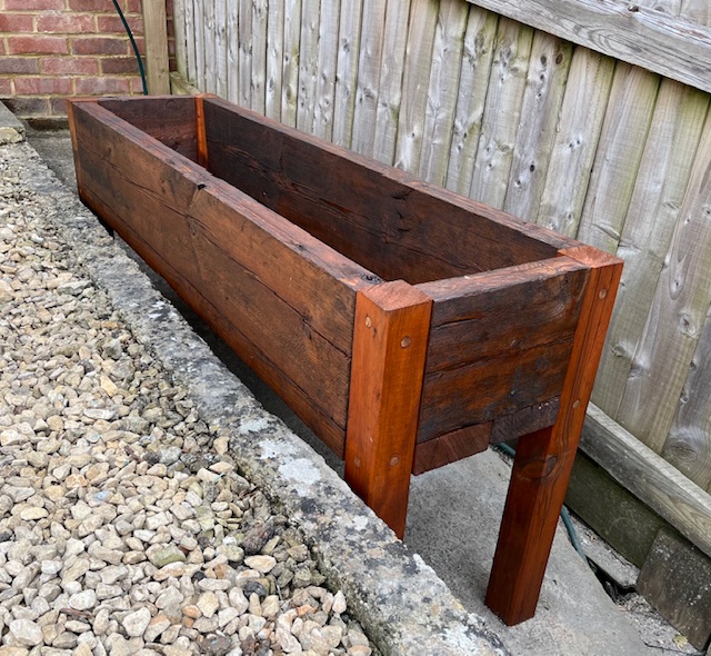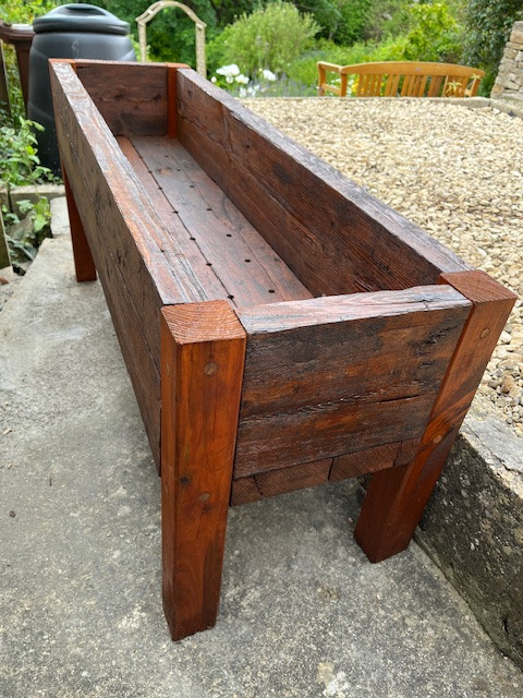 Not exactly up there with the precision of that *exquisite* Gee-Tar above, but the stability and levelness of a chunky planter I made for Mrs Merman made me stand back with folded arms and nod quietly to myself in knowing satisfaction. She requested a free-standing planter to be made for a very specific location: on an uneven lumpy path that sloped in two planes, so no two legs could be the same length or have the same footprint. Yes, I suppose fitting some adjustable feet might have been an option but hey. The trough was made from some half-rotten scaffold boards I found at the bottom of the garden, and the legs are a 75mm fencepost. The plugs which conceal the screw heads are short lengths of broken drumstick. Et voilá!