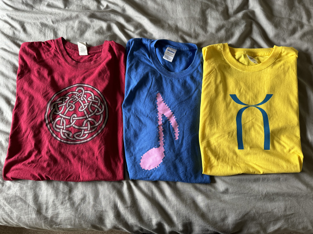I did put a design on a tee shirt yesterday, though; I’ve got two King Crimson tee shirts with the cover designs from two of their three 80’s albums, ‘Discipline’ and ‘Beat’, the red and blue ones in the pic, but ‘Three Of A Perfect Pair’ is only available with the name of the band and album printed across the top, so as it’s a fairly simple image, I thought I’d have a go at doing my own.