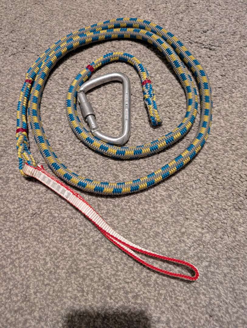 So I rummaged around. Found a length of old prussic cord (tree surgery spec not climbing spec, I think it's 10mm).