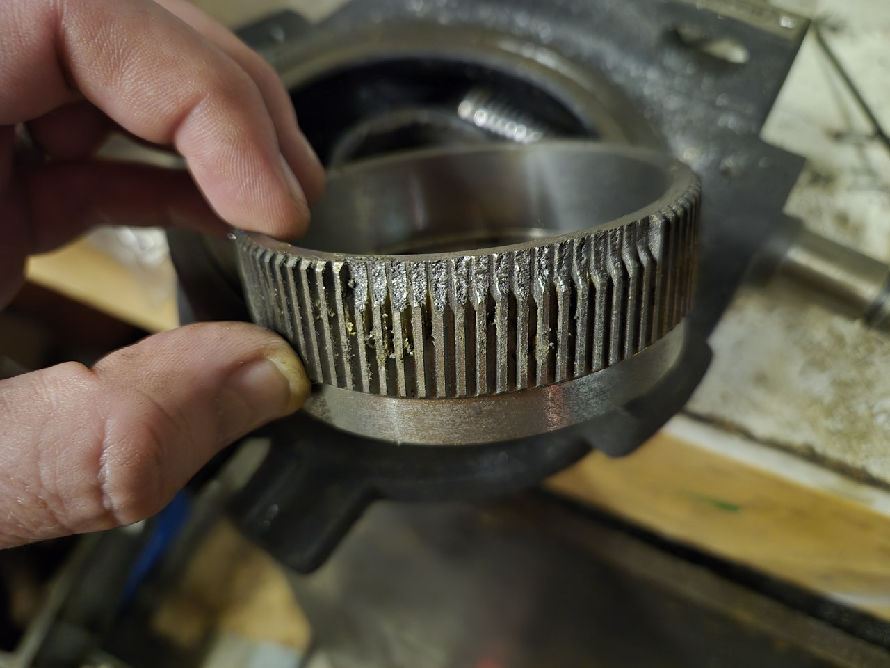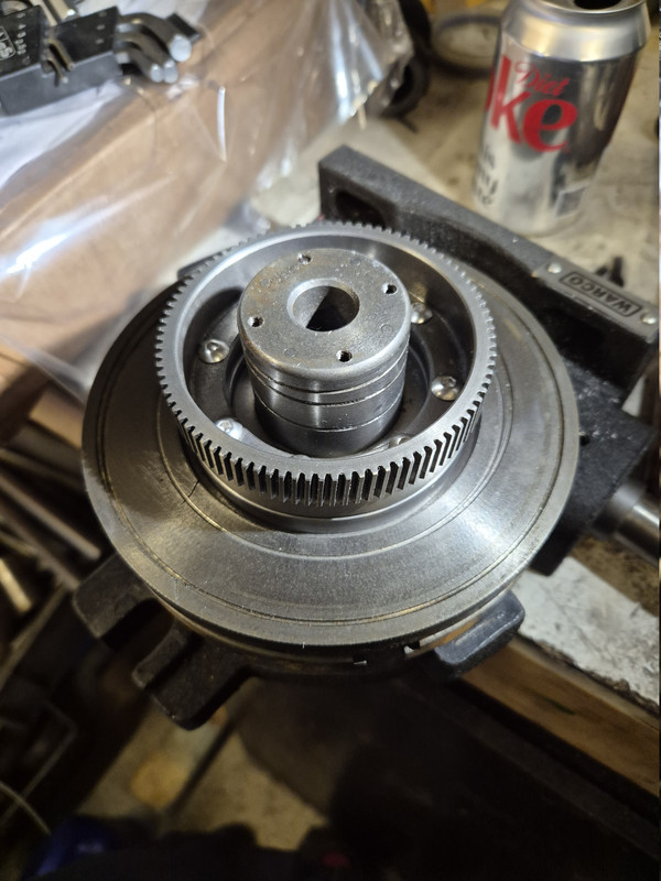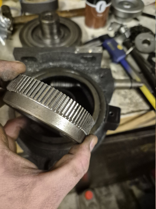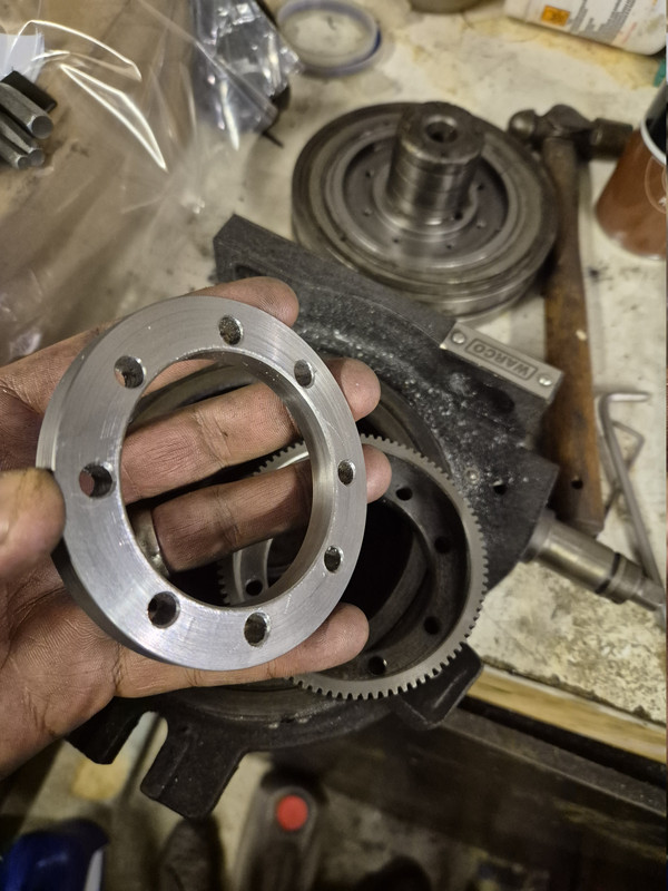 Made an 8.75mm spacer to drop the gear down onto the undamaged teeth. The hole pattern was not regular spacing which was a PITA.
