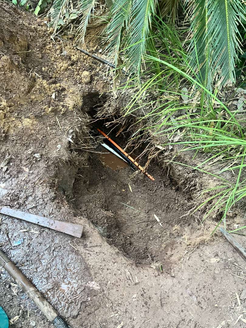So that left it to me to dig up the pipe. It’s a bit awkward because the phone and power lines are collocated. Easy enough to dig without damaging anything, easy enough to cut the pipe. But an anger fest trying to fit the joiners and get them done up tight.