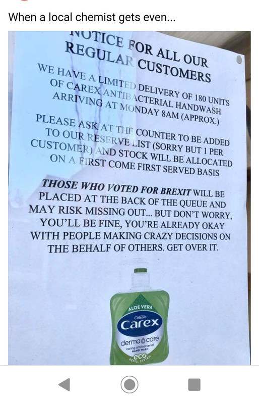 My g/f works on the till at B&M, and uses hand gel during the day, because she’s handling money and her hands get dirty, obviously. Anyway, yesterday some woman saw her using it just before being served, and demanded to know why the bottle wasn’t on the counter so that customers could use it! Jo pointed out that it would be stolen almost as soon as she put it there, to which the daft bat replied, ‘no it wouldn’t!’ Jo replied, people are stealing the bottles of hand sanitizer from the wall in hospitals, so they’ll definitely steal hers! (Fact, btw)*, The woman behind just rolled her eyes, talk about a sense of entitlement big enough to have its own postcode.