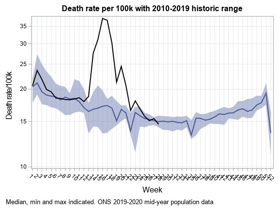 A little more good news on excess mortality this week - there isn't any. Only one age group (F 65-75 excess 35 deaths). Also the trend is tracking the mean rather than tanking below it - hence "they would have died anyway" is currently not supported, but we shall see for the 2H2020.