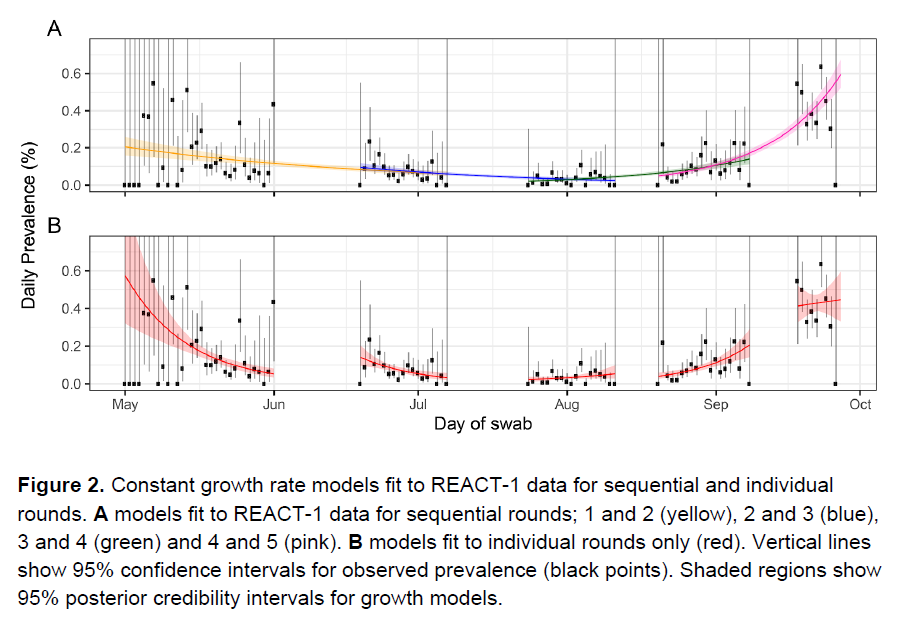 Figure 2 shows that the slope WITHIN a survey period is indeed flatter for the REACT-5 sample, which was one week, but taken across the five surveys, the course of the trajectory is blatantly obvious! The rate is not slowing. Is one week long enough to measure the rate? The confidence interval for slope matches the continuous top plot of the same data. I'm not convinced by measurement of R.