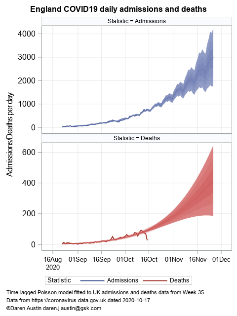 Indeed - sadly the negative curvature is modest at best but highly statistically significant. That's a 90% prediction interval for daily observations from a Poisson regression. Uncertainty may be over-dispersed with a wider interval. But it's not looking great - "Baked in". London, the SE and the SW are about 10-14 days behind, as these bulk up the numbers, a pure log-linear exponential may be a better description - hence the 500. But London is locking down earlier than the North.