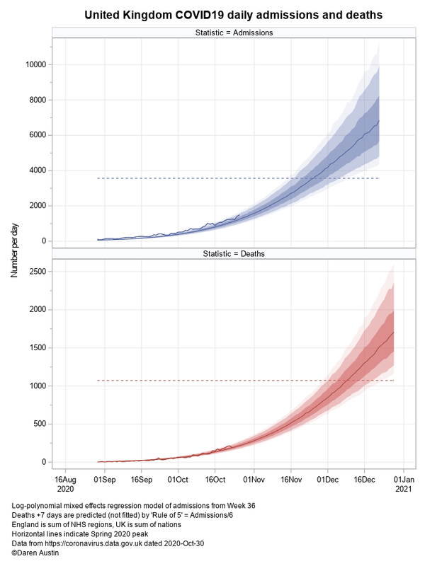 On the predictions, I have no idea how PHE/Cambridge can legitimately predict 1000 deaths/day tomorrow. That's just bobbins as @thecaptain mentioned. My projection if nothing changes (well obviously they will) - deaths are not a model fit. Ratio is more like 5 rather a week later. It doesn't predict a peak in all regions and the UK is a sum of four countries, and England the sum of seven NHS regions. Dashed lines are the previous Spring peak. Nothing confidential here and leak-free!
