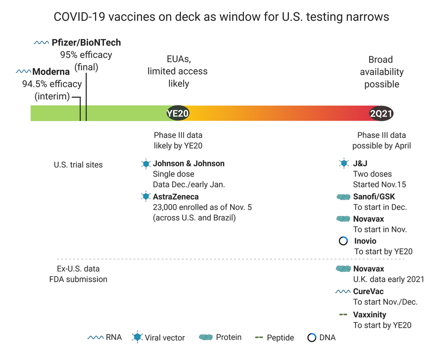 The window closes on US testing because once one is approved, placebo controlled trials become ethically challenging. Indeed maintaining subjects on placebo is challenging. Protein, peptide and virus-based vaccines are precedented. The mRNA are a new modality, but the delivery mechanism for them has been used for delivery of other drugs. Approval for a conventional vaccine and new drug application (NDA) is conventionally 12 months from date of submission. Yes, you read that correctly - it takes the FDA a whole year to review a new drug. Six months for a supplementary drug application (sNDA).