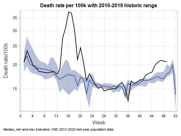 For some good news - I did say I'd show the excess mortality figures. For Week 49, they fell to 17% above 10-year mean. this is the effect of lockdown2 feeding through. they might have another week or so to go. I thought they would stabilise but they have fallen slightly.