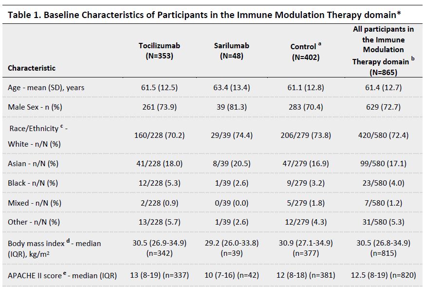 Demographics were not dissimilar to the previous ICNARC data - note the elderly do not routinely go into ICU so will not have been treated. Mean age is 61.4. Take off 25 (2xSD) for lower 95% confidence limit giving a lower bound of about 40. Yes that young. Significant imbalance in gender, and a median BMI of 30 (which may also correlate with the gender bias). Note these are critically ill COVID patients, not the mild/moderates most often studied. For comorbidities, 35% had diabetes (see BMI), 24% had respiratory disease, 10% had cardiovascular disease.