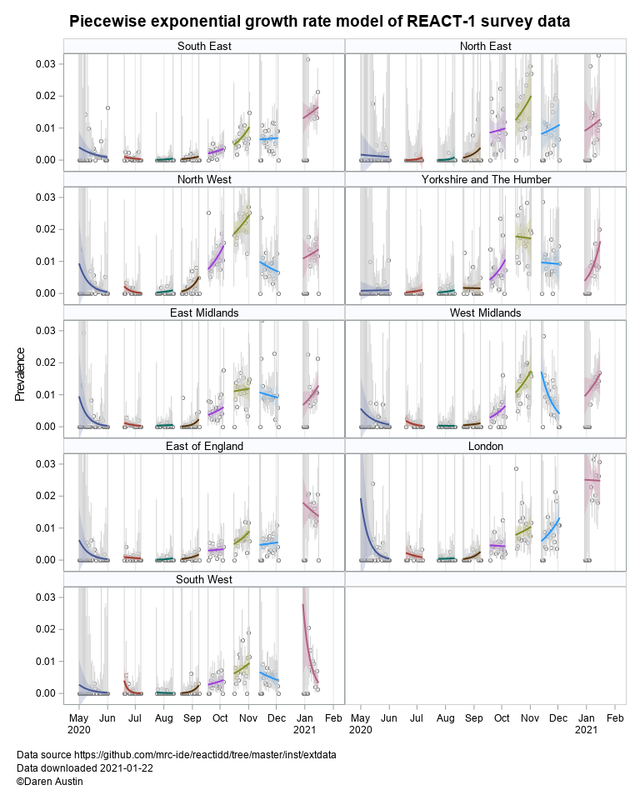 Well the most recent survey is really too far apart from the others for this to work. So below is a plot of just a regression of each survey for each region. For REACT1-8, the most recent survey, the ONLY slope significantly different from zero is the SW. And it's negative. The others are consistent with flat, up or down. I suspect their survey missed the peak. Anyway, I am not concerned, and the reporting is at odds with the strength of the data. @thecaptain will be along to agree with me about the perils of fitting splines where there is no data.