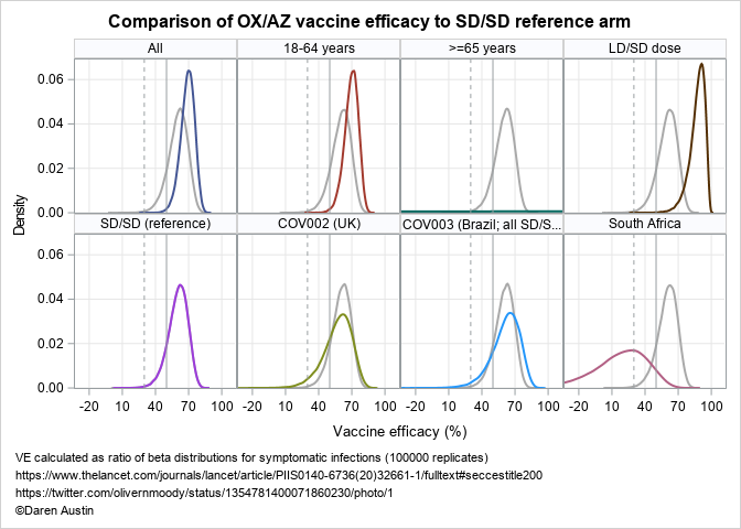 Spent a few hours looking at the Oxford/AZ data in more detail. Taking the standard dose subjects as reference, below is the vaccine efficacy of the various subgroups. Two points; efficacy in the over 65's is unknown. Completely unknown. Approval is entirely based on antibody response and an expectation of some protection from morbidity at the very least. Second point, the efficacy in the South Africa trial is evidently lower, even with the much smaller trial. There is some overlap in uncertainty of response, but not a lot.