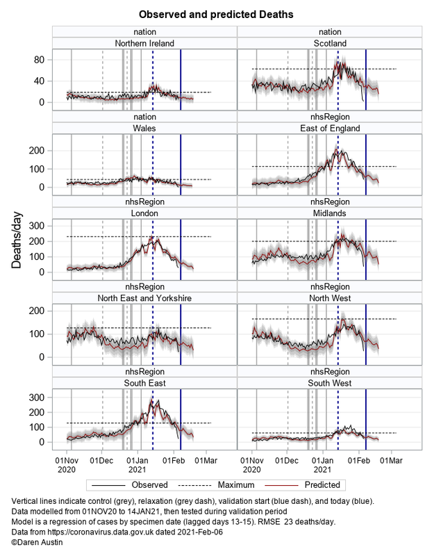 Still as predictable as ever... In a good way. I have yet to add vaccinations to the covariate mix as the data is only national, but deaths should decouple from cases eventually, then admissions.