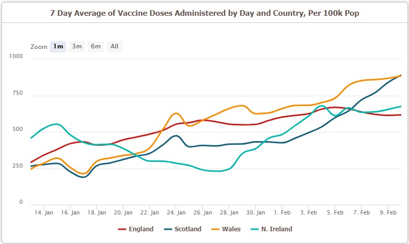 The number of 80-year-olds vaccinated in Scotland by Friday stood at 13% – in Wales it was 24%, in Northern Ireland it was 45% and in England it was 56% – some four times the Scottish figure.