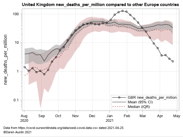 UK deaths per million vs. all other European countries (mean and 95%CI, median and IQR). Note deaths track the European trend very closely, slight decline for lockdown2, Christmas peak and then a dramatic fall. Lockdowns and vaccinations work: