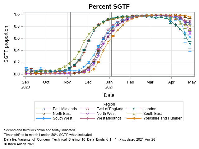 Here's plot of that data (Fig 17) from my own analysis. Recall that the UK variant does not read the S-gene - hence S-Gene Target Failure (SGTF) is used as a proxy for the B.1.1.7 strain. You can see in this data that emergence of SGTF and decline is just shifted in time, likely after multiple founder effects from importation of new variants from South Africa and India. This is "microscope epidemiology". This level of granularity has never previously been available in real time - does it matter? I'm not so convinced, I think vaccines will continue to offer protection against morbidity, if not symptoms.