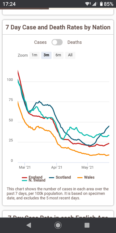The case rate in Scotland has been rising for the past couple of weeks but it doesn't yet appear to have been reflected in hospitalisation / fatality rates.