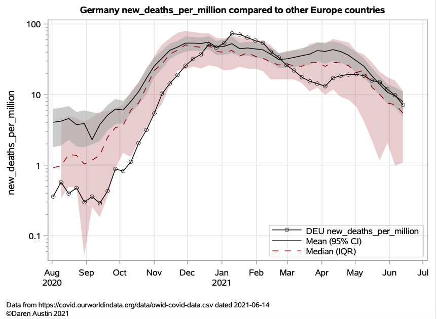 Whilst the UK did not exactly cover itself in glory. Germany has a deathrate that has tracked the Euro norm very closely. We exceeded it after Christmas thanks to lack of restrains and B.1.1.7. Happy to provide the plot, but Germany does not have a lot to shout about. Sweden is at the European average (note the upper quartile range is quite close to the median at the moment). Norway is a consistent star - Be. More. Norway.