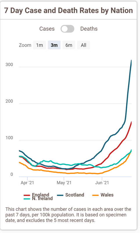 It feels very much like we are in "let it rip" territory now in England, topped off with what little Javid has said since taking over from Hancock. Drakeford seems slightly more conservative with the Welsh approach than Sturgeon does in Scotland right now, but I'm expecting both to be running out the summer far more cautiously than Boris.