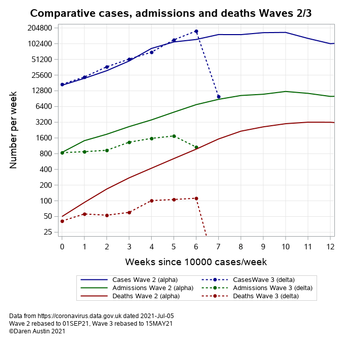 Comparison of Wave 2 with the current wave - ignore the last datapoint since it's not a complete week. Anyway, cases doubling every 7-14d. Admissions doubling every 4 weeks (it's a log-2 scale to read). Deaths are following admissions. What's notable is the difference from Wave 2, where cases admissions and deaths were largely parallel (proportional on a log scale). We are at about 400 admissions/day at the moment - perhaps 1000/day in six weeks time.