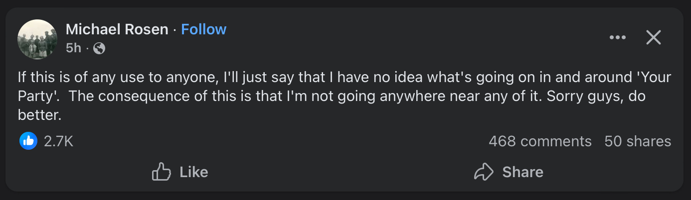 That lawsuits article needs to be viewed in conjunction with this one - just to complete the Your Party masterful media experience:
