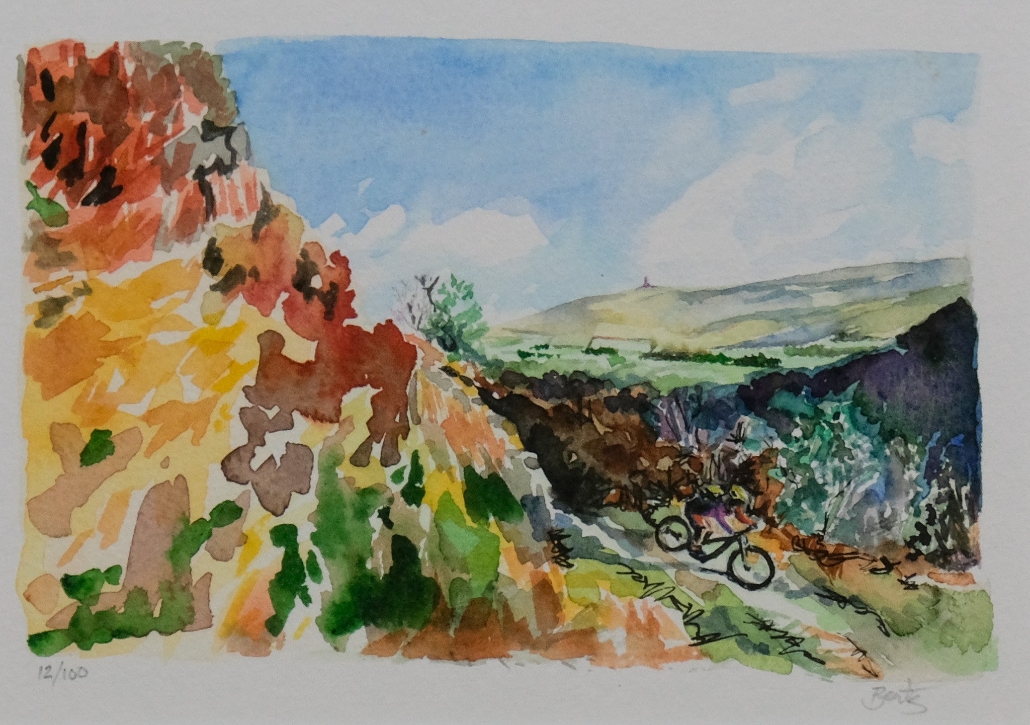 “This is my home territory and it can be a riot of colours jumbling over steep slopes. I know this point well, where everything rushes together as you emerge from a technical section at speed with all the heathers and greens trying to grab your attention whilst you’re trying to focus on the path in hand. It’s an unmistakeable landscape, with Stoodley Pike on the horizon promising so many other paths and tracks to winch your way up and drop down.” Beate Kubitz